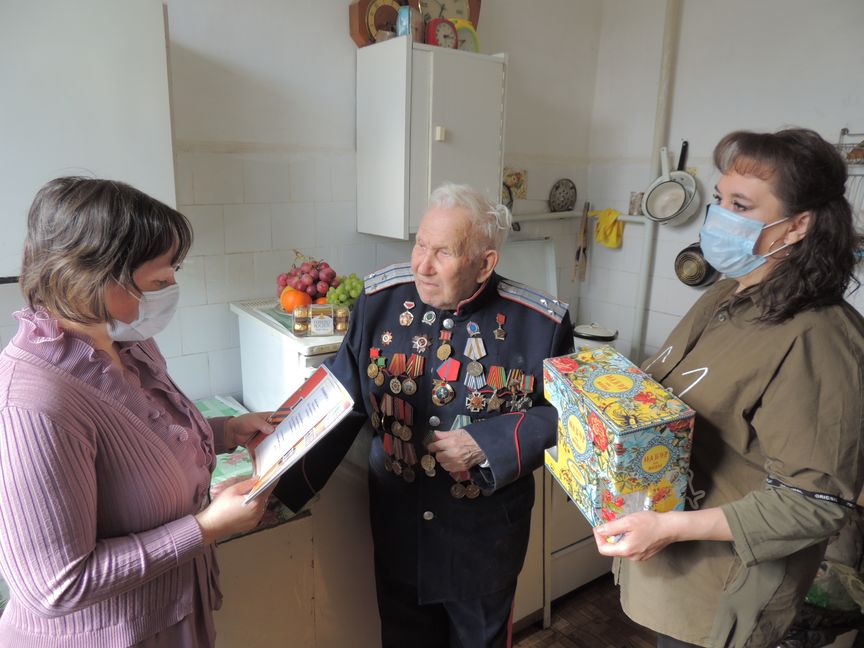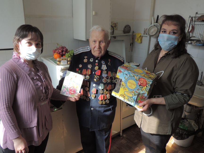 В этот праздничный день ветерана поздравили сотрудники нашего центра: заведующий отделением социального обслуживания на дому Наталья Ишмуратова и социальный работник Наталья Филатова. Они зачитали ему поздравление, вручили подарок, и пожелали добра, мира и благополучия.